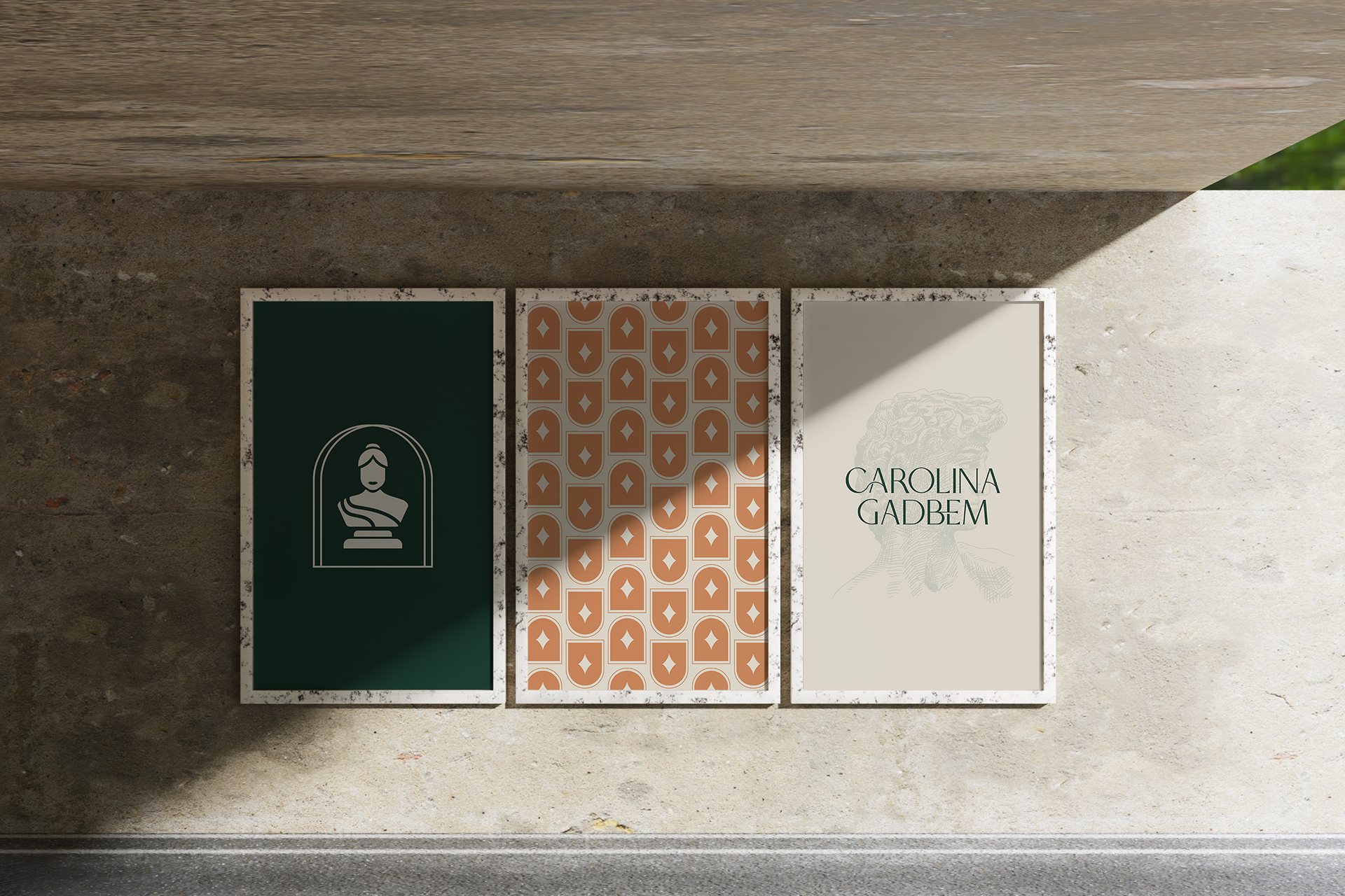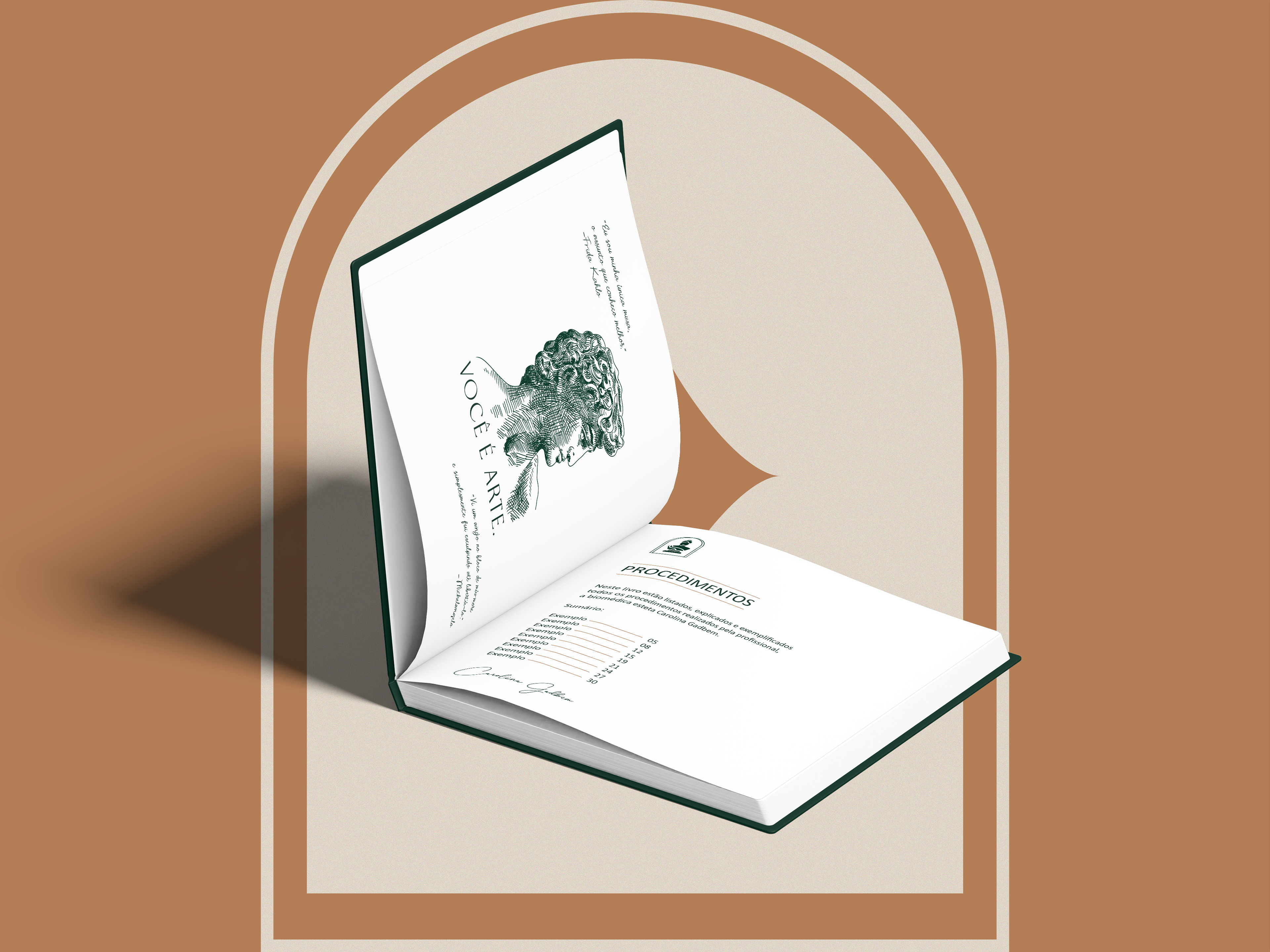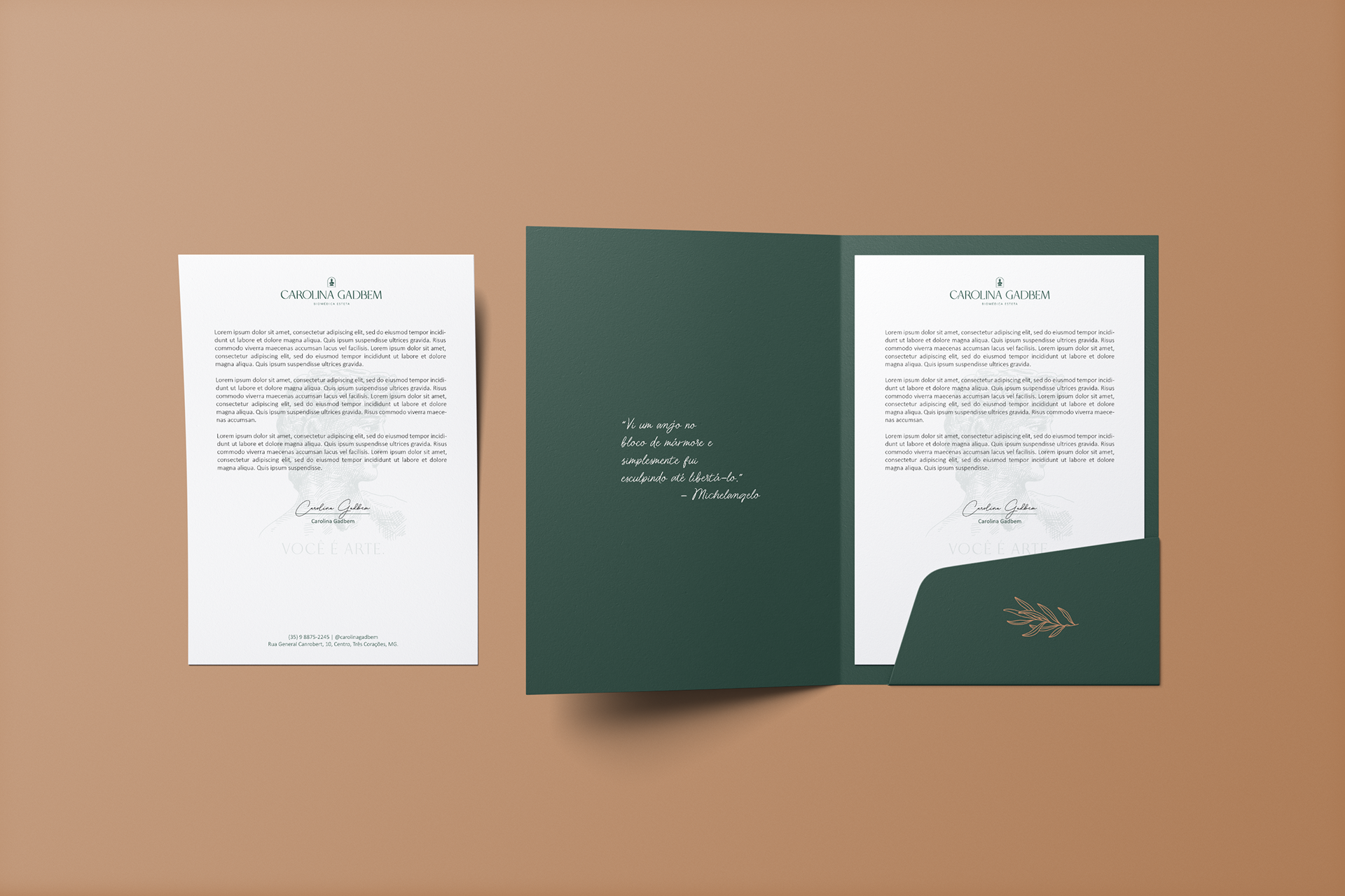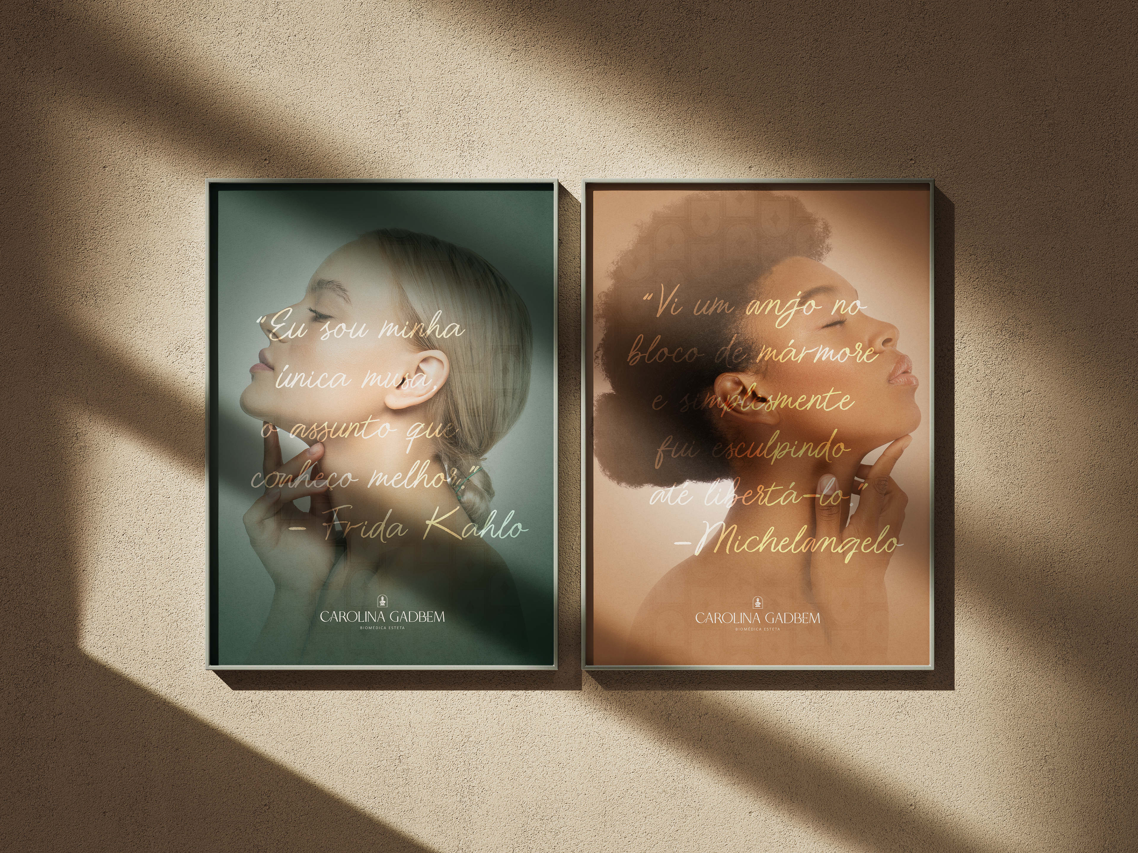Following this line of thought, and also what Carolina herself said about “polishing the lines without altering them”, the entire design was developed around the idea that Michelangelo's phrase, “I saw an angel in the block of marble and I simply sculpted it until I freed it.”, he tells us that the beauty is already there, you just need to polish it, sculpt it. The visual identity was built around this idea, placing the client as art to be modeled by the artist.