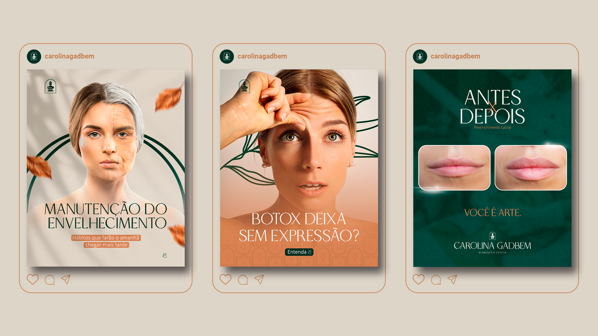 Carolina Gadbem is a biomedical doctor specializing in the area of aesthetics. She will develop work on facial harmonization and aging maintenance, maintaining her main focus on the naturalness of her clients, not altering their features, but rather polishing them. Her audience consists of women aged 30+, with a certain purchasing power, being middle class / upper middle class.