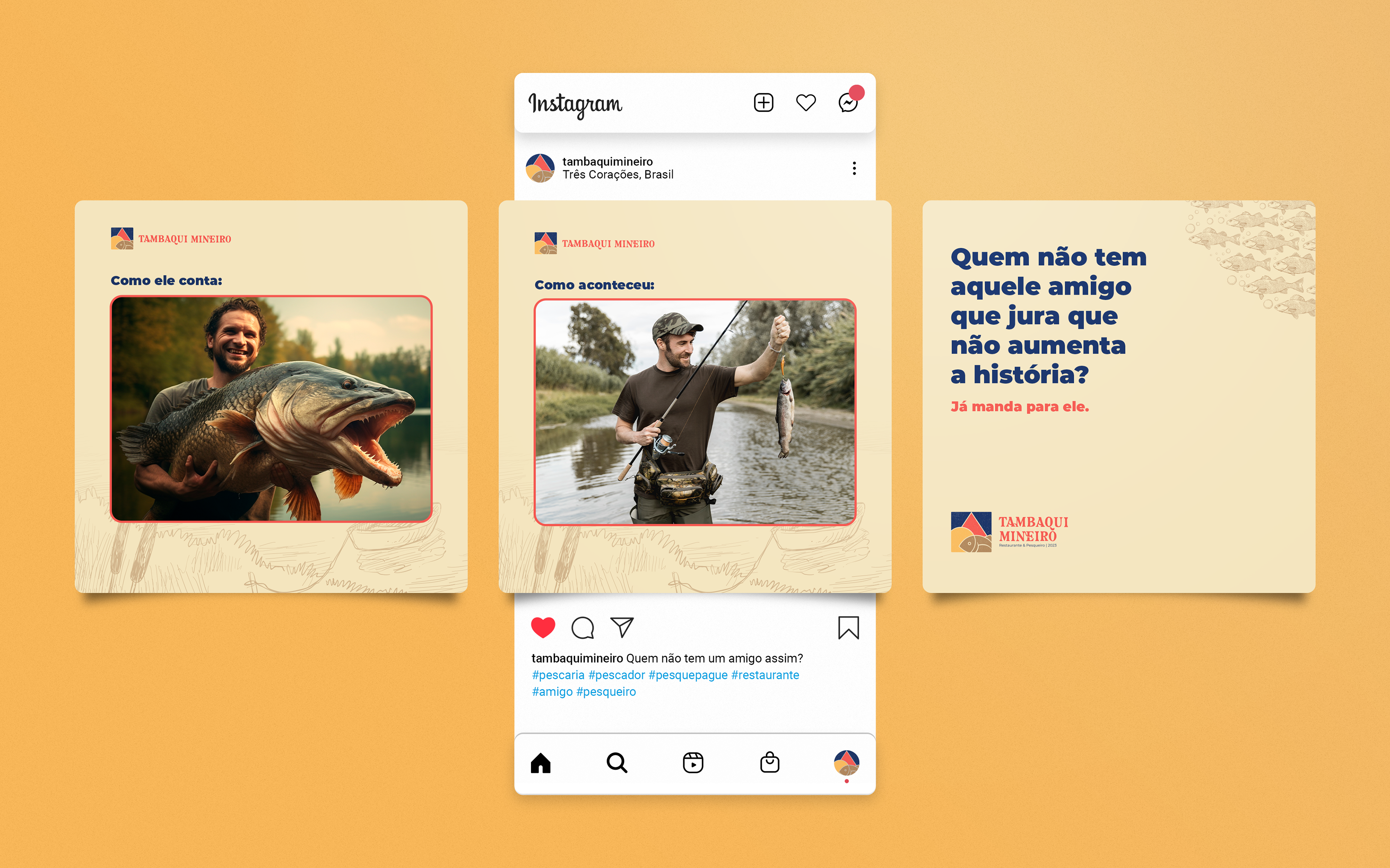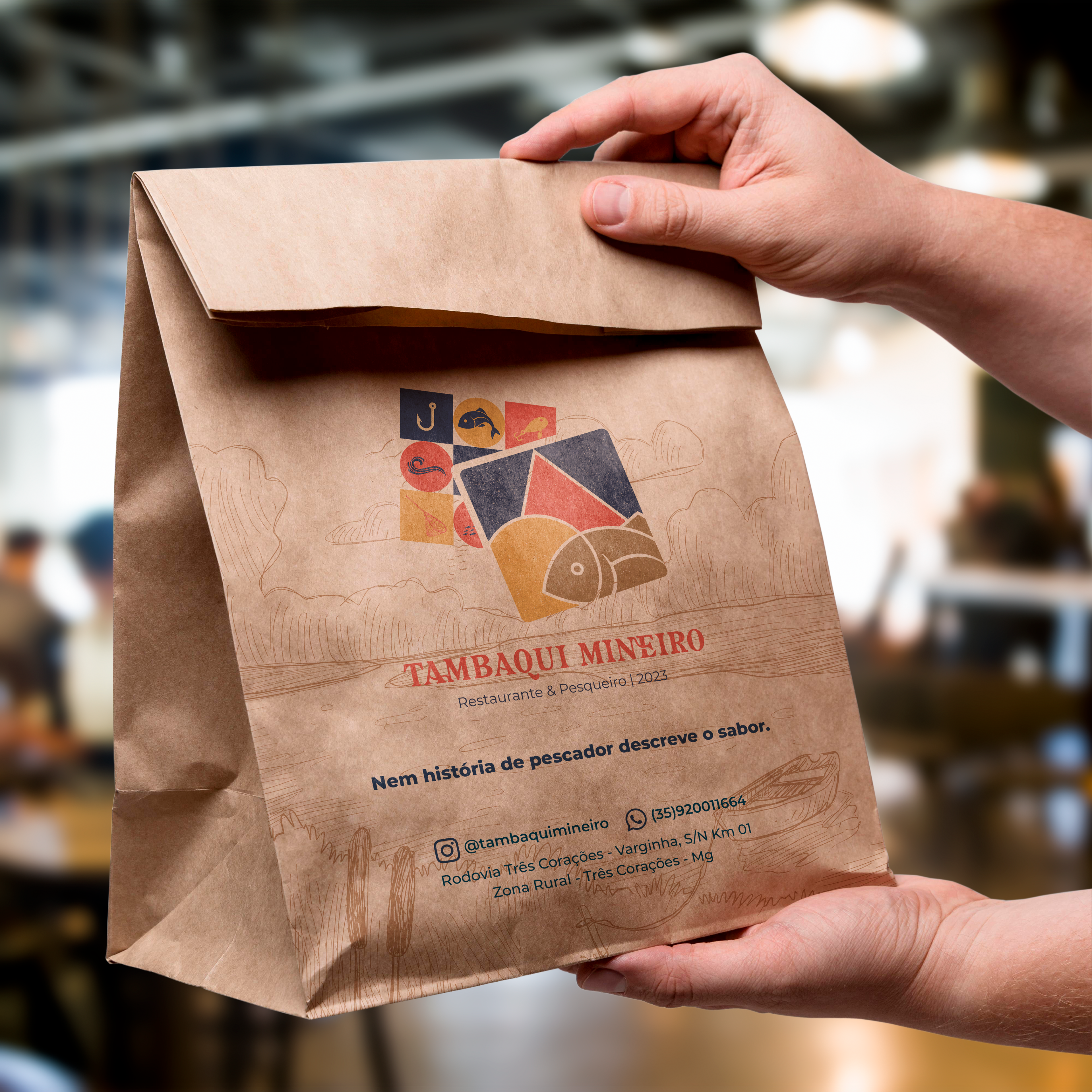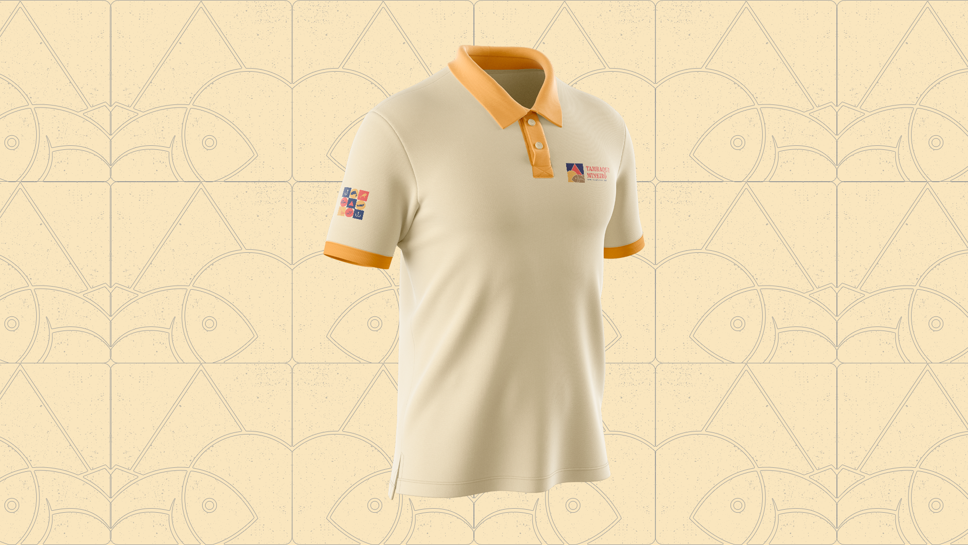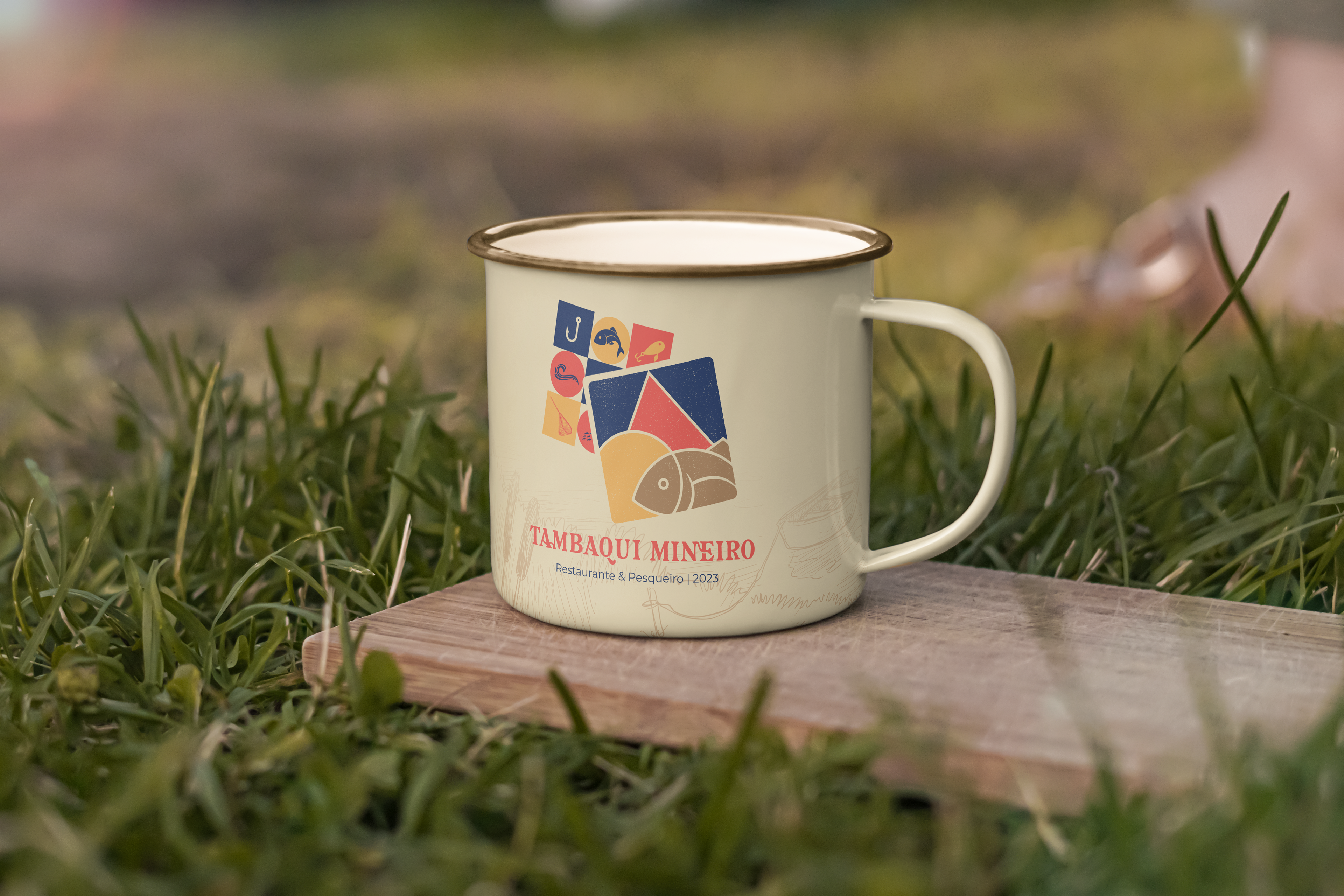 For the development of the symbol, it was thought to unite elements that referred to fishing on a sunny day, to the triangle in the center of the Minas Gerais flag, referencing "Mineiro" from the brand's name, and also, when colored, referring to the colors of the flag of Amazonas using blue, since tambaqui is a fish of Amazonian origin. The other colors used, brown and beige, refer to something rustic, from the countryside, reminiscent of food cooked in the countryside. The functionality of the symbol is maintained when in black, white, or other colors.