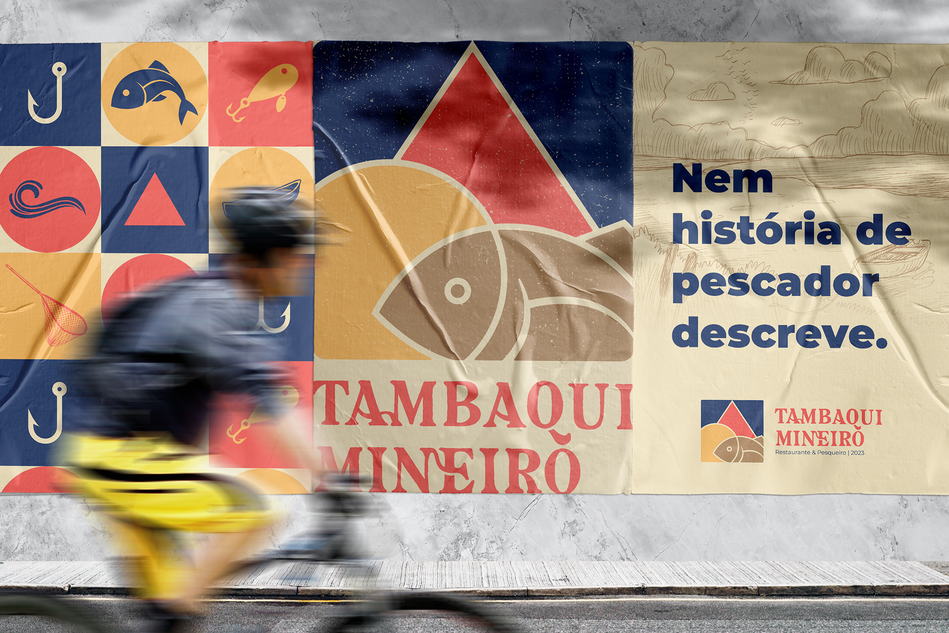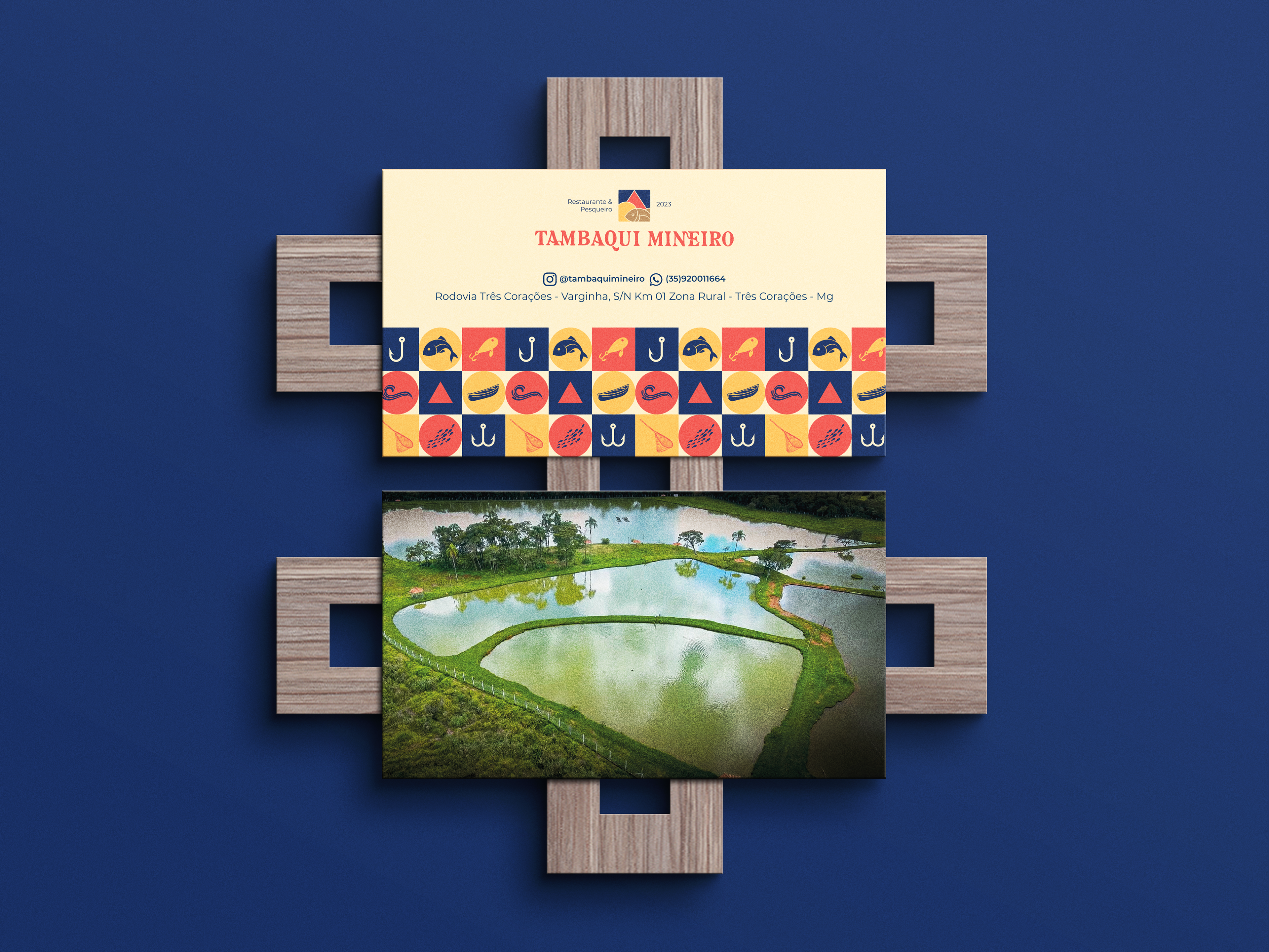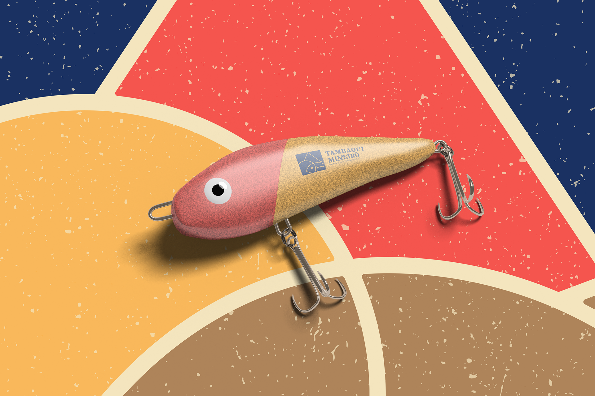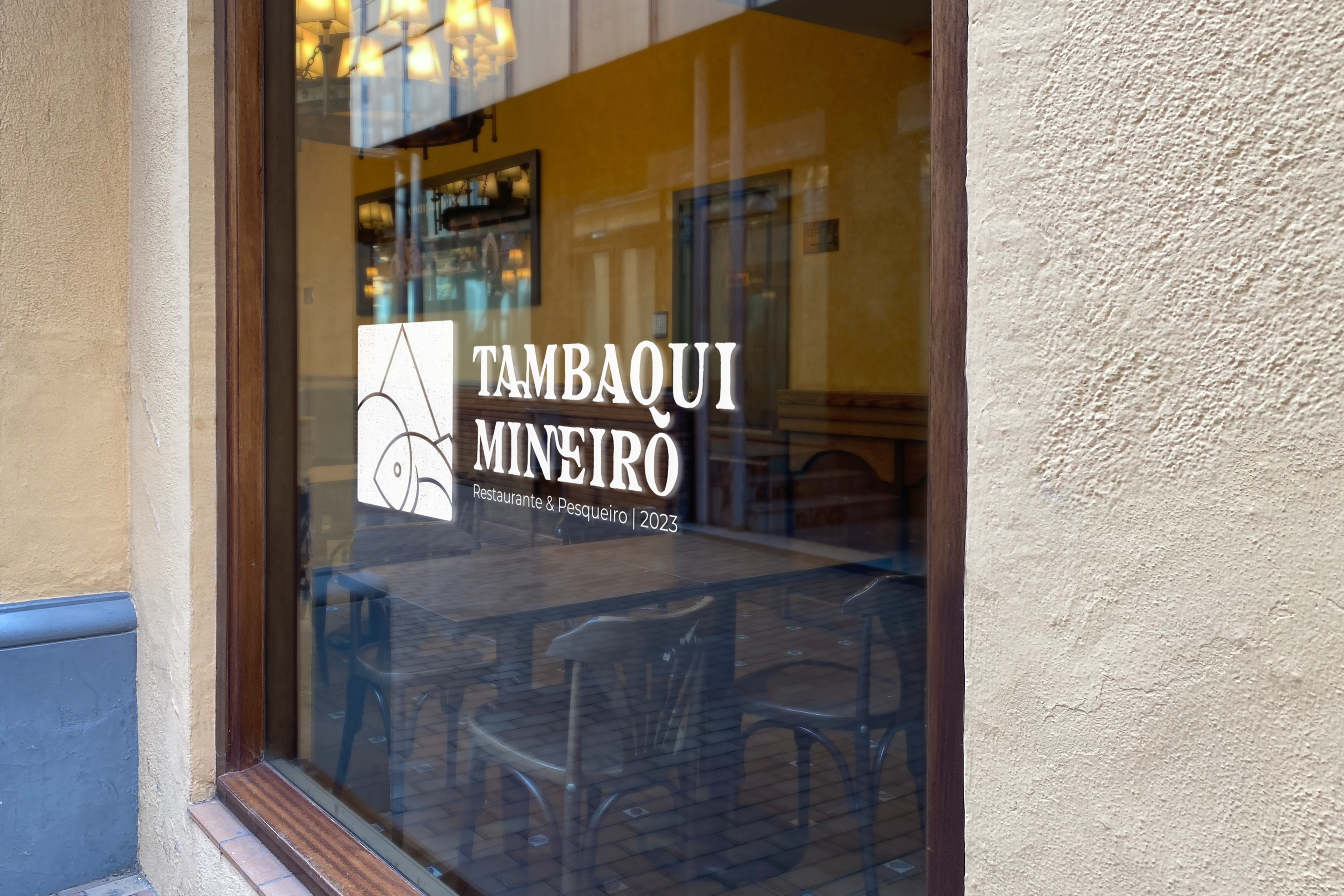 For the development of the symbol, it was thought to unite elements that referred to fishing on a sunny day, to the triangle in the center of the Minas Gerais flag, referencing "Mineiro" from the brand's name, and also, when colored, referring to the colors of the flag of Amazonas using blue, since tambaqui is a fish of Amazonian origin. The other colors used, brown and beige, refer to something rustic, from the countryside, reminiscent of food cooked in the countryside. The functionality of the symbol is maintained when in black, white, or other colors.
