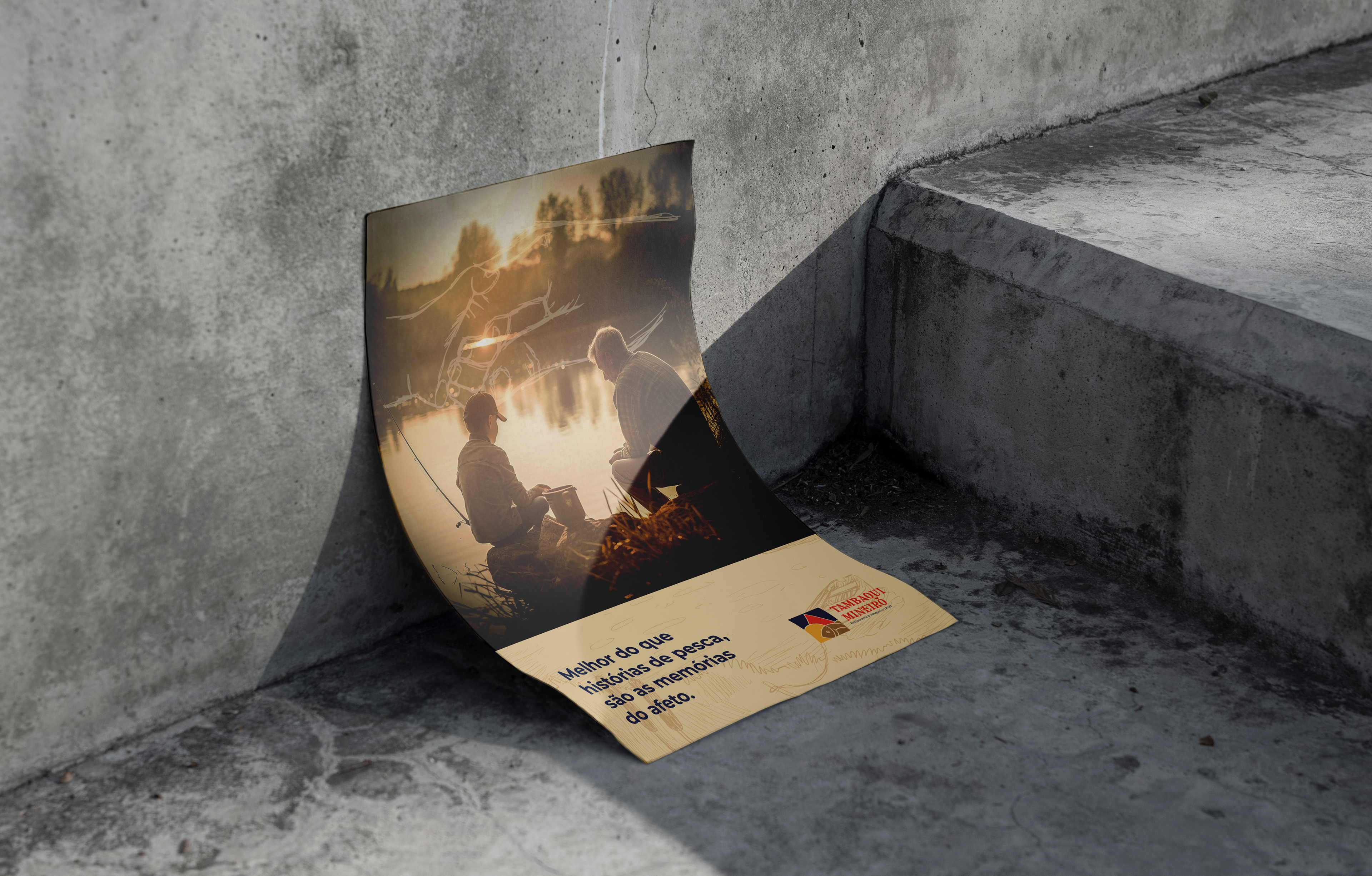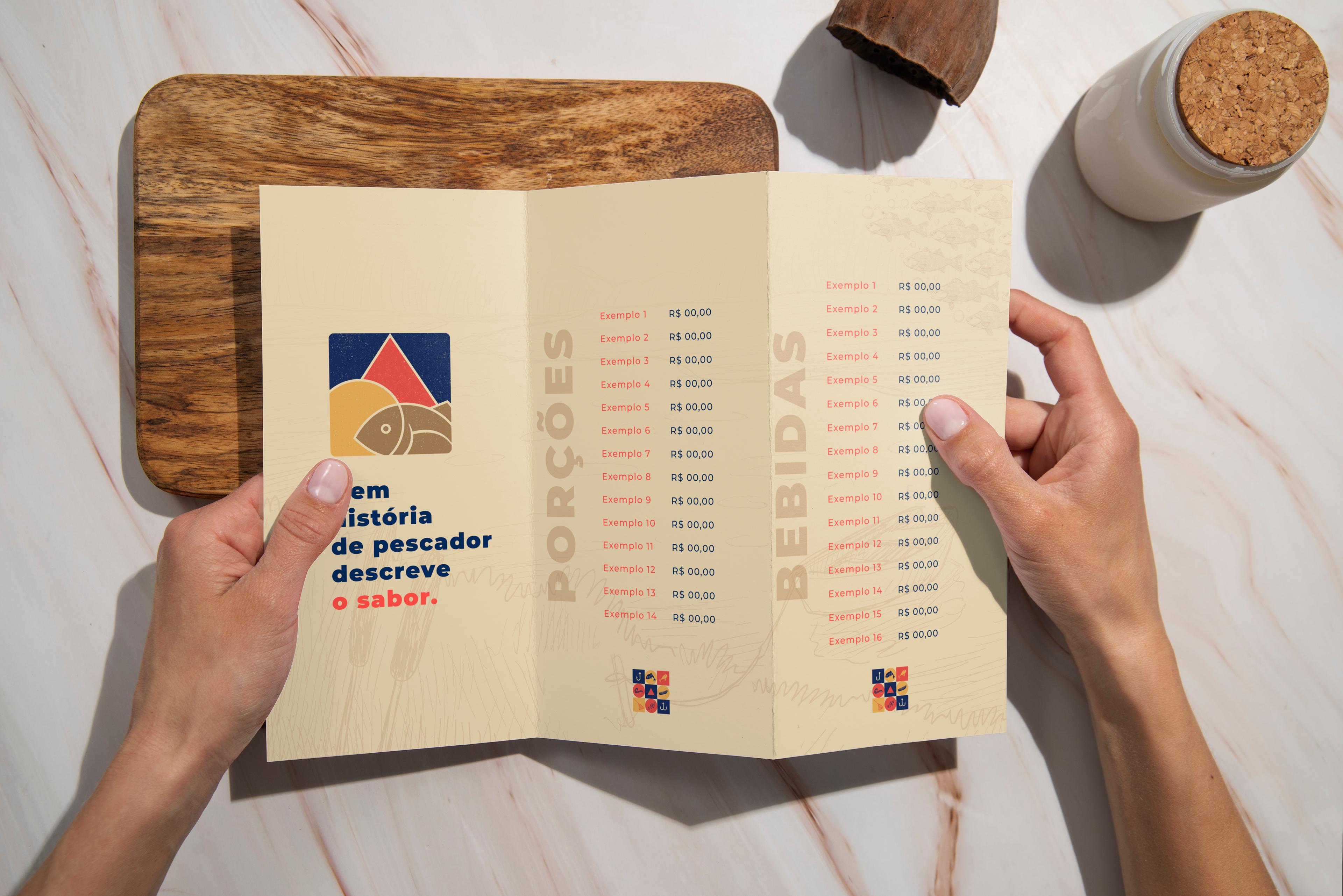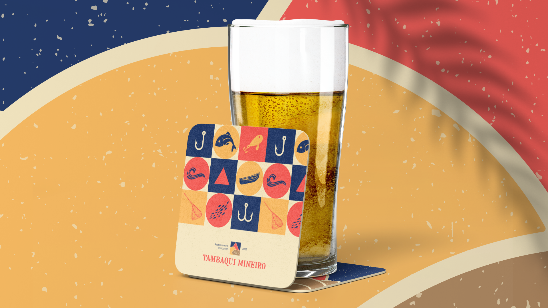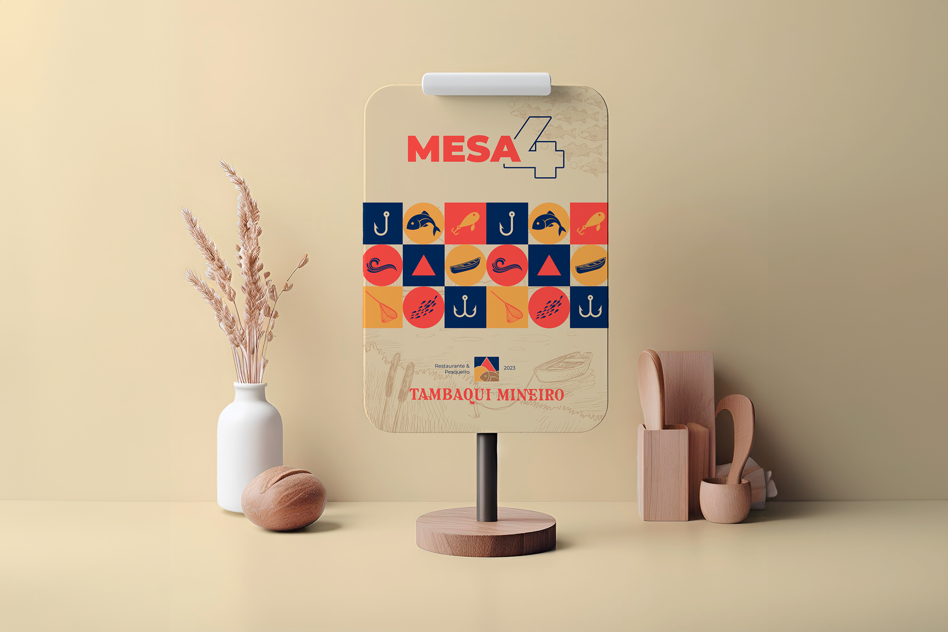 For the development of the symbol, it was thought to unite elements that referred to fishing on a sunny day, to the triangle in the center of the Minas Gerais flag, referencing "Mineiro" from the brand's name, and also, when colored, referring to the colors of the flag of Amazonas using blue, since tambaqui is a fish of Amazonian origin. The other colors used, brown and beige, refer to something rustic, from the countryside, reminiscent of food cooked in the countryside. The functionality of the symbol is maintained when in black, white, or other colors.